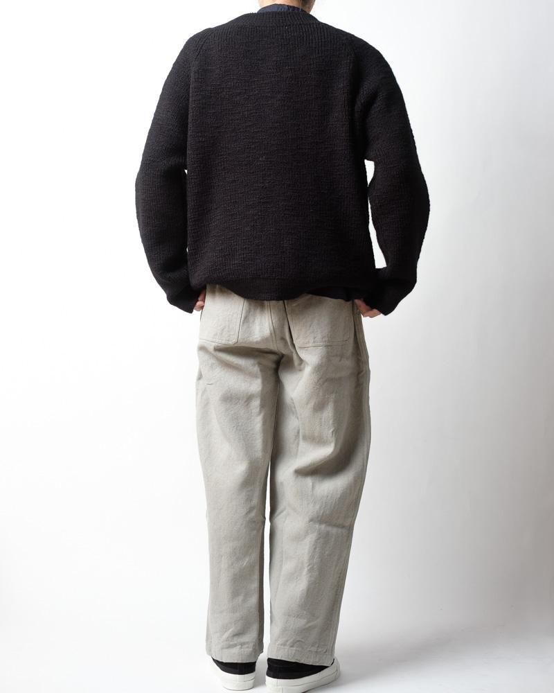 パターンは亜麻苧麻ロングをベースに、裾幅を太くしたストレートシルエットとし、後ろポケットも若干大きくしています。