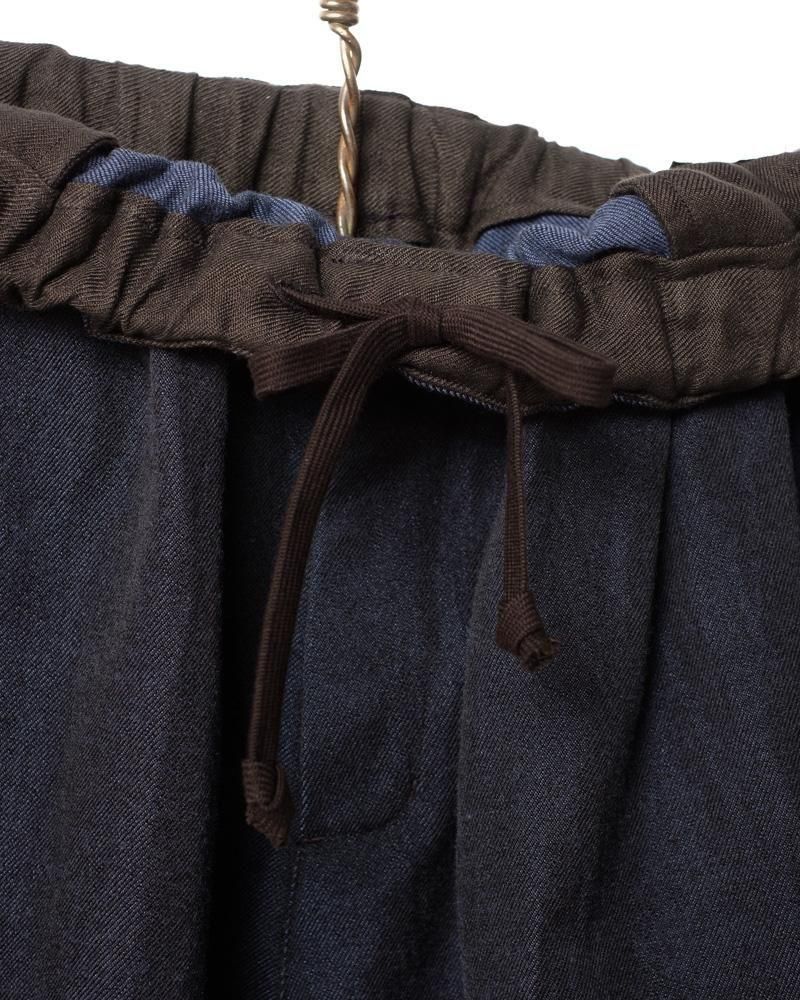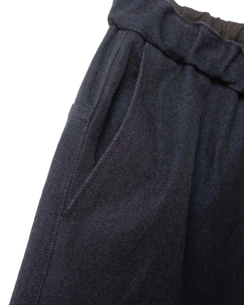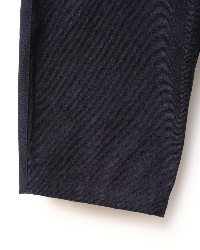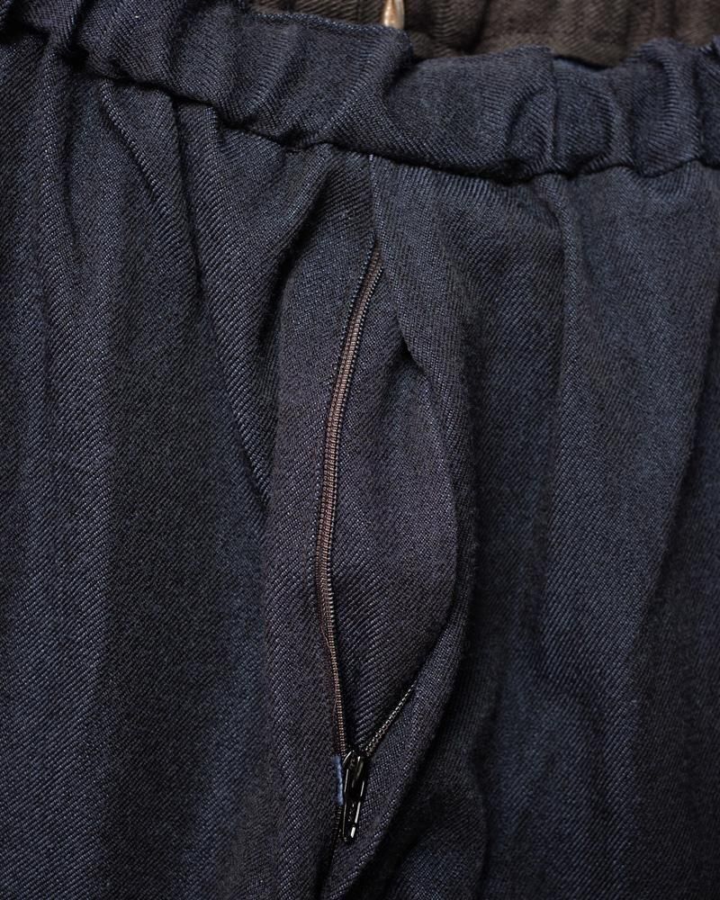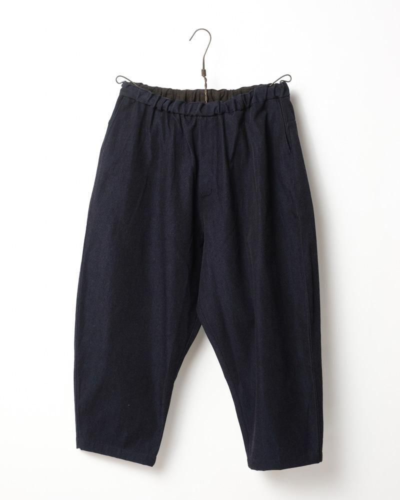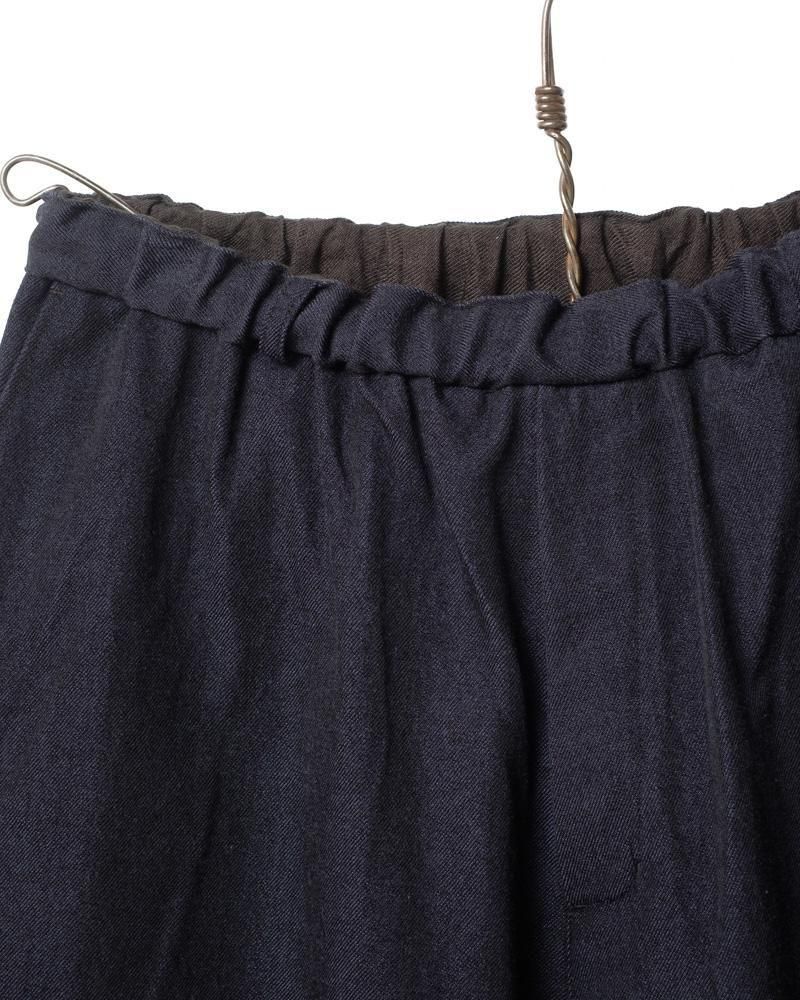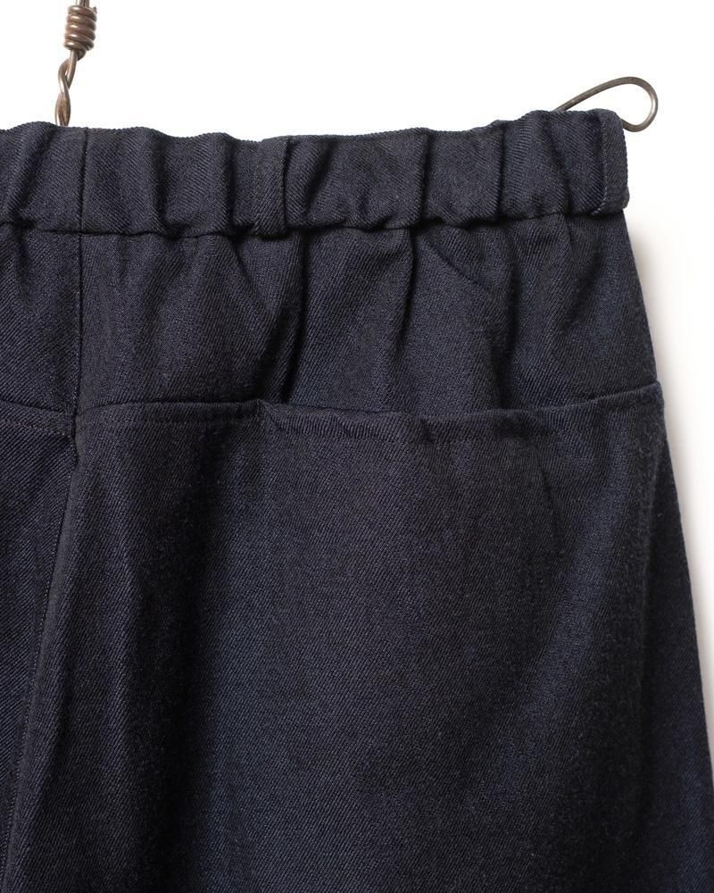 パターンはもんぺやたっつけを参考にしたMITTANの定番的なシルエットのパンツです。股上は深いものの、運動量を確保しているので動きやすいのが特徴で、膝から裾にかけて入っている急なテーパードは、ロールアップによって調整が可能です。機能性を備えながらもシンプルなデザインの為、体型を問わず好みのサイズ感を選んでいただけます。後ろポケットは、切り替えを利用した仕様になっています。