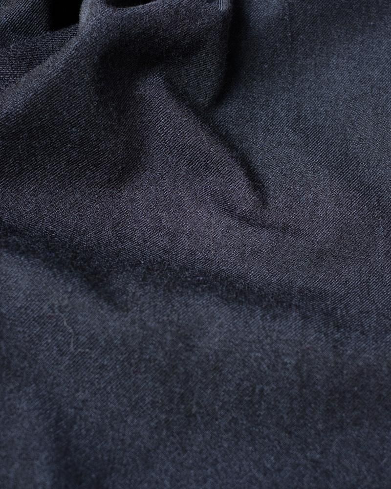 経糸にはノンミュールジングウール、緯糸にはオーガニックコットンを先染め糸で使用し、高密度で織り上げたオリジナルの綾織生地です。ウールにはしっかりと撚糸をかけ、コットンと組み合わせることで、強度を担保しながらも通年使用に適した素材となっています。経糸は全て黒で統一し、緯糸の色違いで白黒や紺黒を展開。色差によりシャンブレーのような微細な光沢と深みのある表情が特徴です。ミュールジング(羊の臀部の皺に病原虫が付着するのを防ぐため、無麻酔で皮膚や肉の一部を切除する行為)を行わない原料を採用し、羊への負担を軽減しています。