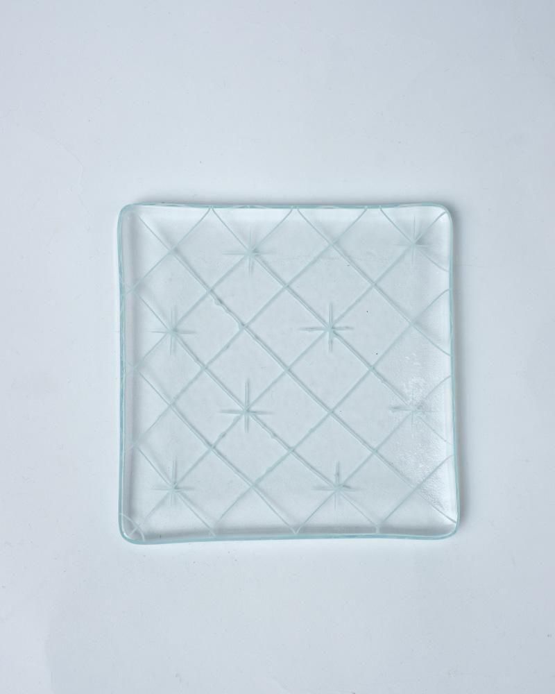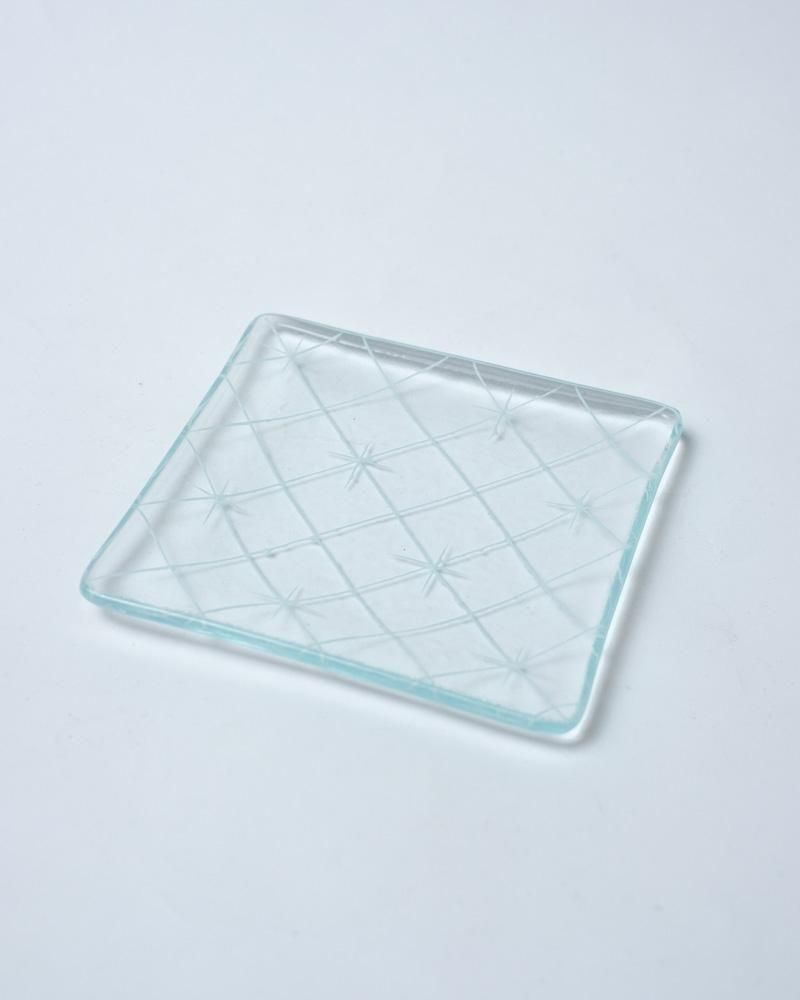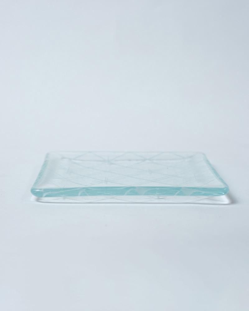 板ガラスに溝を彫り、色粉を詰めて模様を作っている『あやいと』シリーズの角皿。
