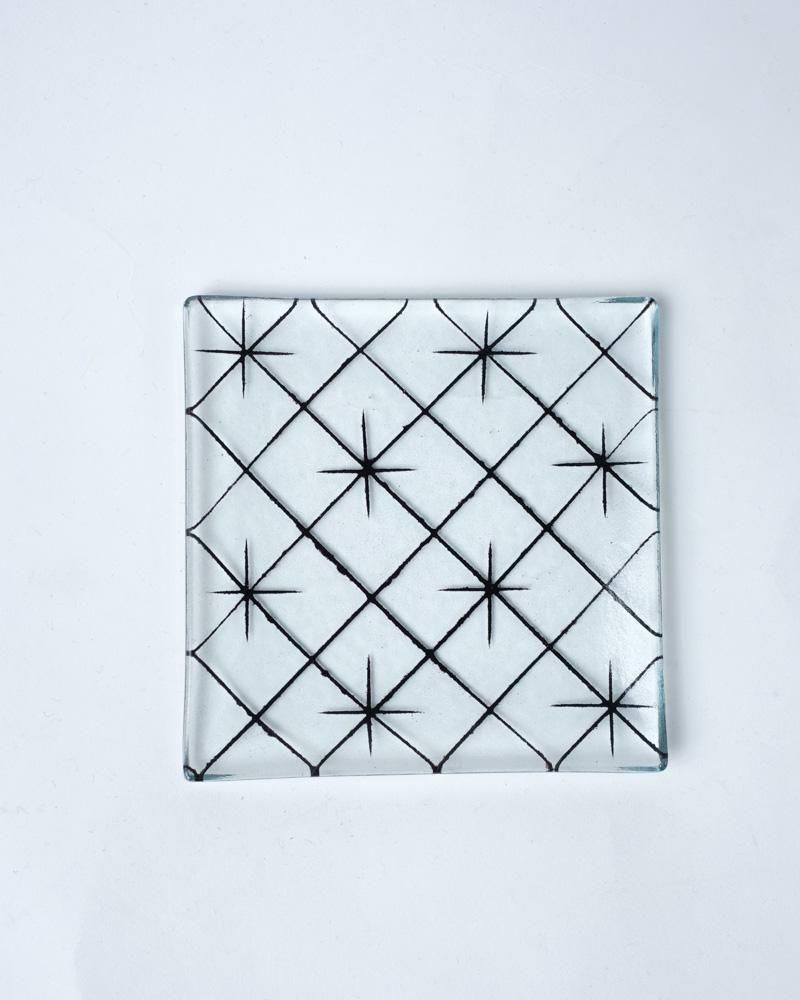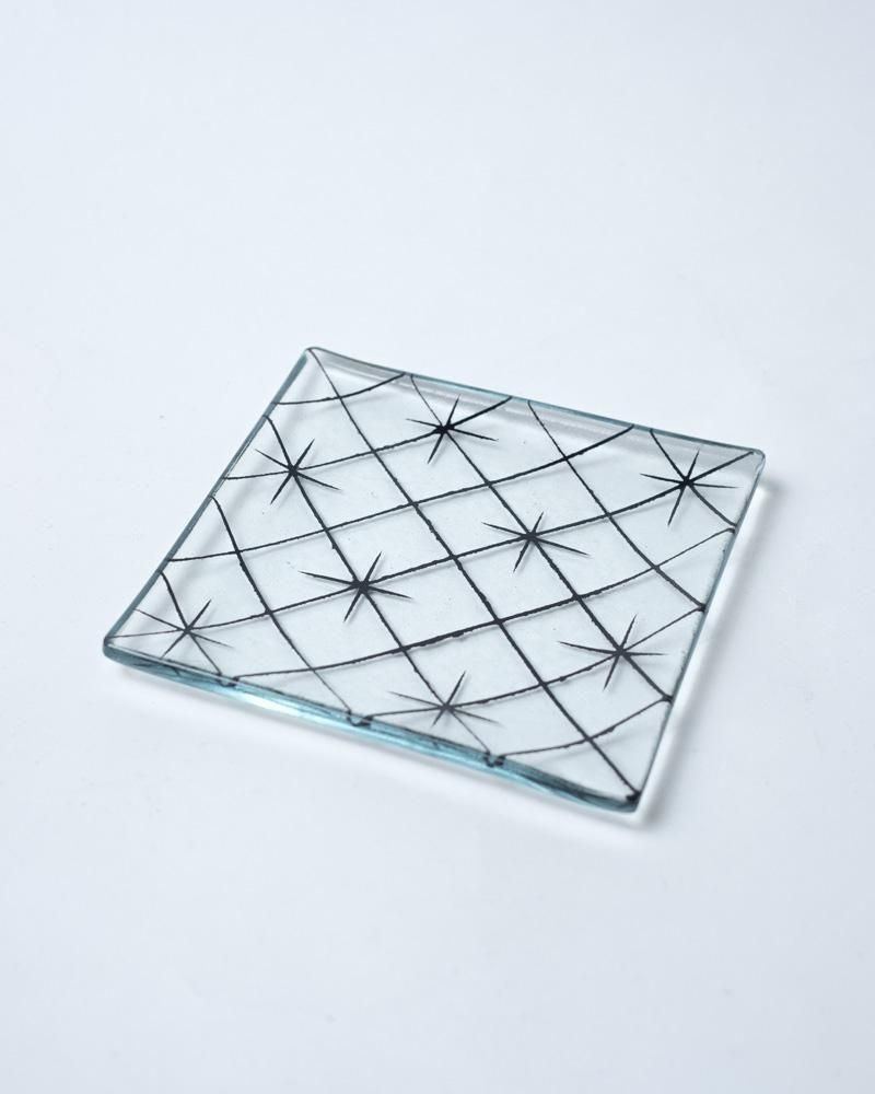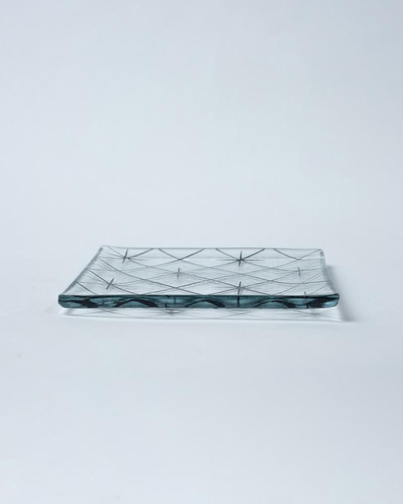 板ガラスに溝を彫り、色粉を詰めて模様を作っている『あやいと』シリーズの角皿。