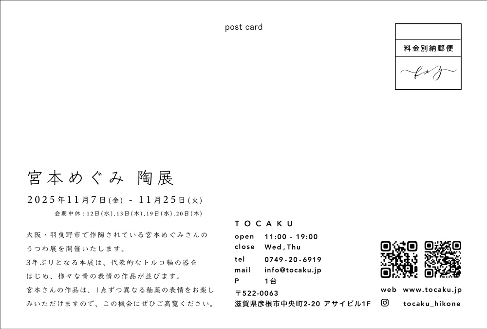 大阪・羽曳野市で作陶されている宮本めぐみさんのうつわ展を開催いたします。