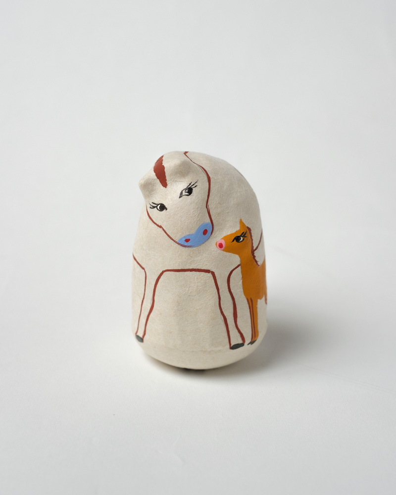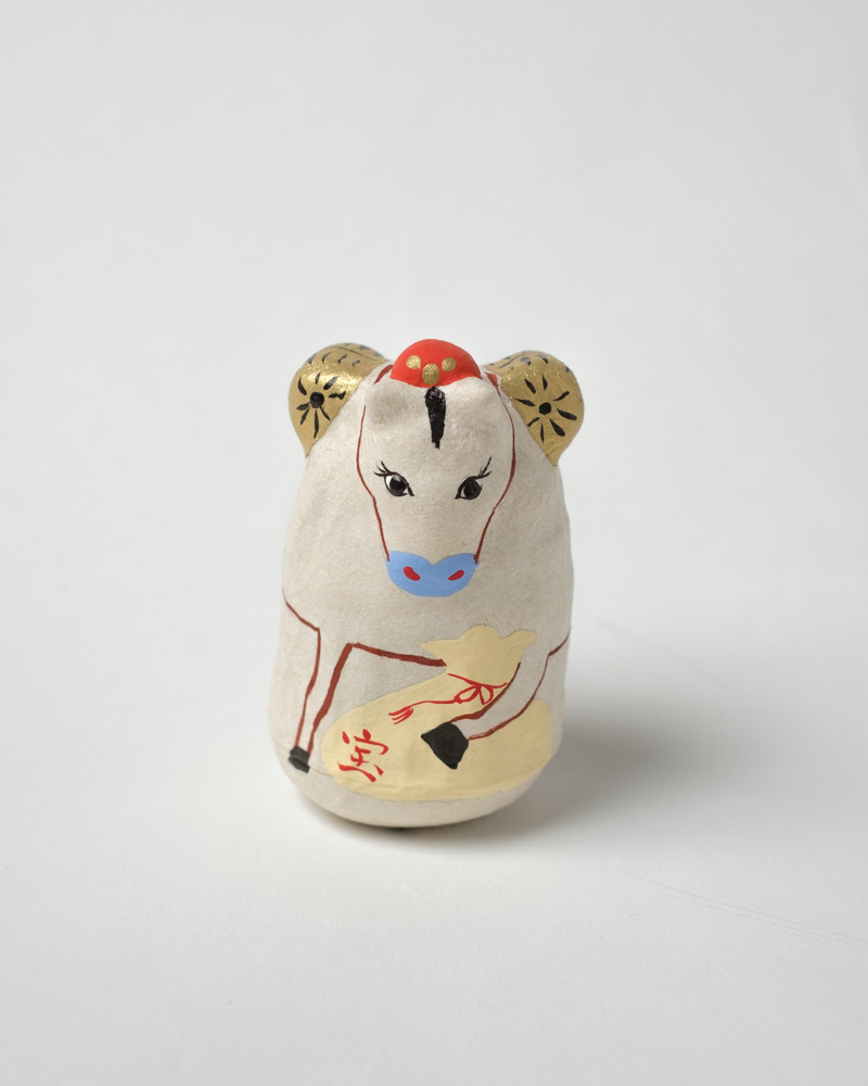 起き上がり人形は、張り子の技術で作られた玩具で、表には花巻市の成島和紙をを貼り、おもりは久慈市の小久慈焼の土粘土を使い、岩手県のものを主な素材として作っています。