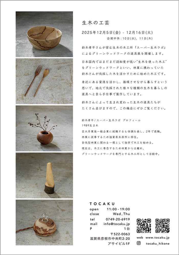 滋賀県米原市に拠点を置き、地元で伐採された生木で木工をしている【スーパー生木ラボさん】の道具展になります。
